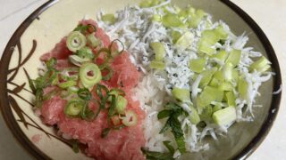 料理・レシピ #20 今日(2025/09/24)のレシピ[ネギトロしらす丼] ネギトロしらす丼時間がない時の一品!あったかご飯に盛り付けるだけ!!ボリュームたっぷりで、ヘルシーです!!!使用した材料(1人前)①釜揚げしらす 50g ➁マグロ(ネギトロ) 100g③大葉 1~2枚④きざみネギ 適量⑤大根の葉(茎) 適量... 2025.09.24 料理・レシピ