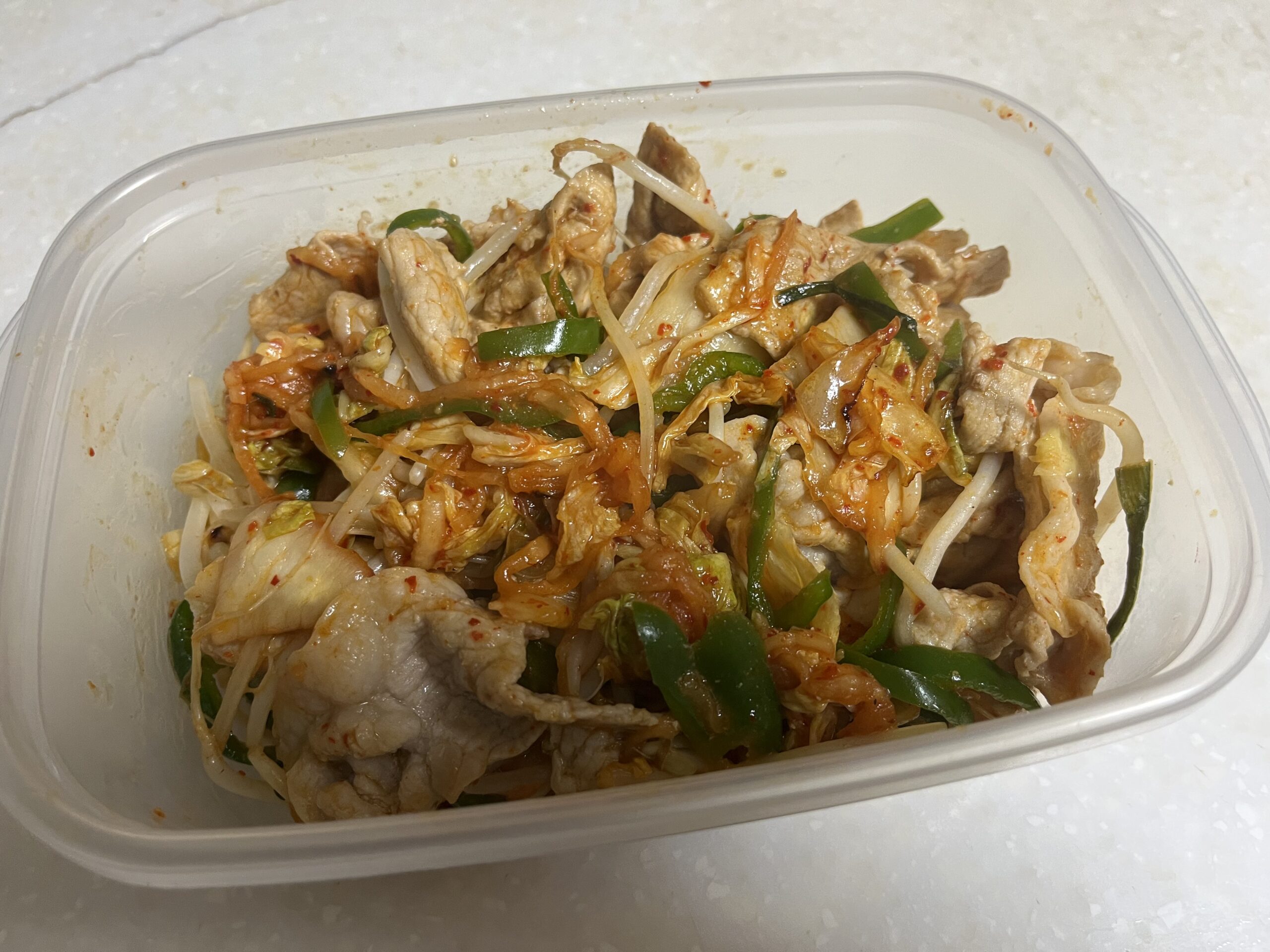 - ピーマンがややしなったら、➁のキムチを入れる。