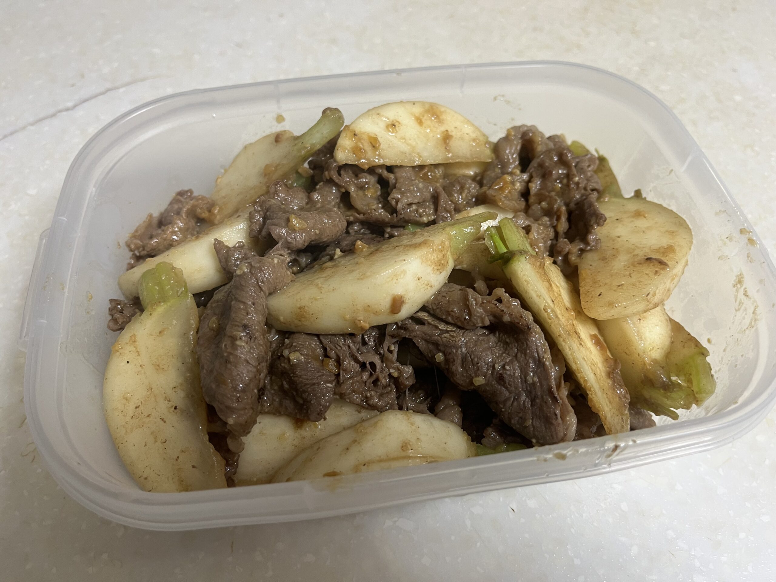 - フライパンに⑦ごま油をひいて、①牛こま肉を炒め、1のかぶも一緒に炒める。